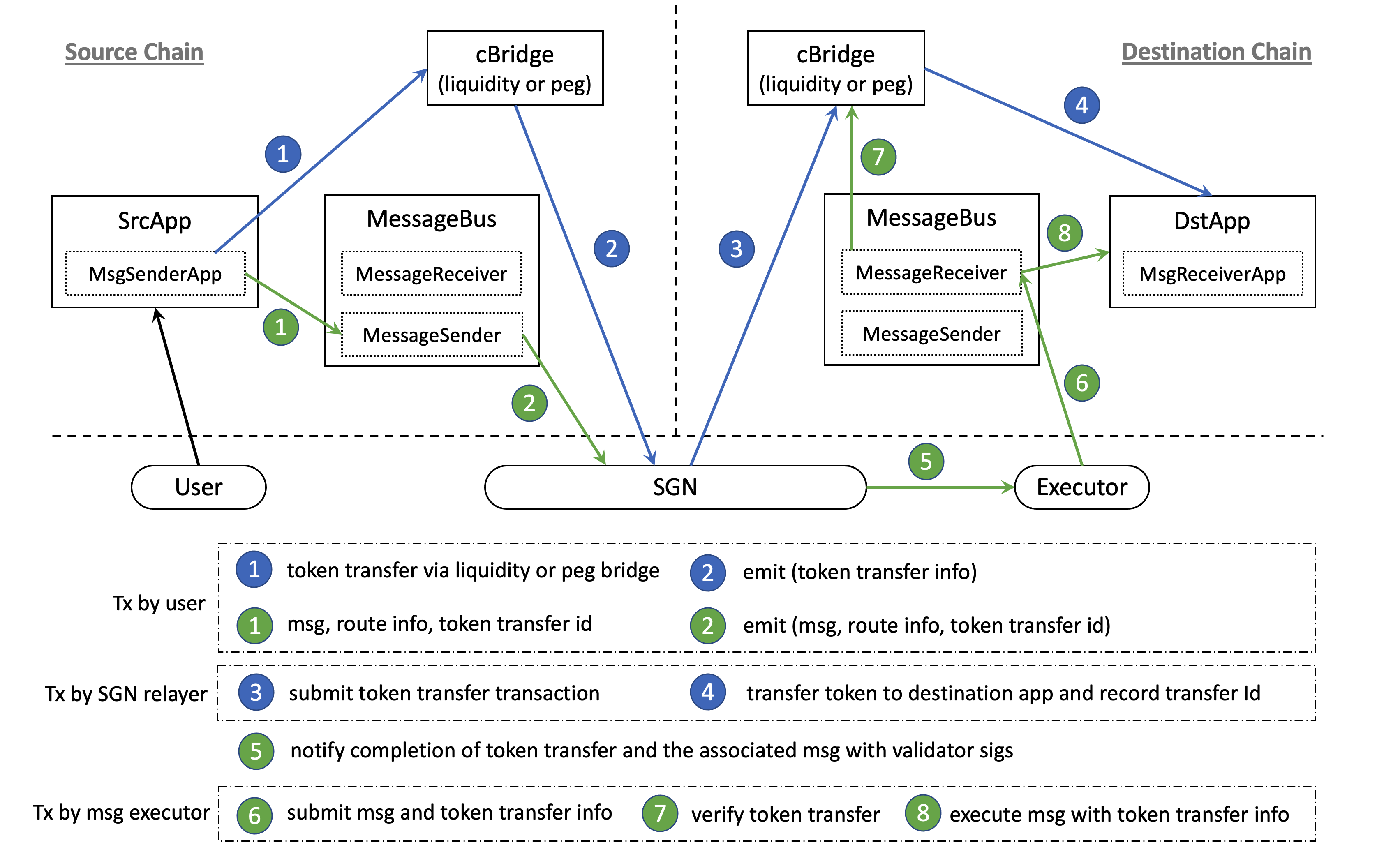 SrcApp at the source chain wants to send some tokens to DstApp at the destination chain, along with an arbitrary message associated with the transfer. Figure below describes the end-to-end flow of such transfers. Blue represents token transfer flow, while green represents message passing flow. Numbers show time sequence, which means steps with the same number can happen concurrently.