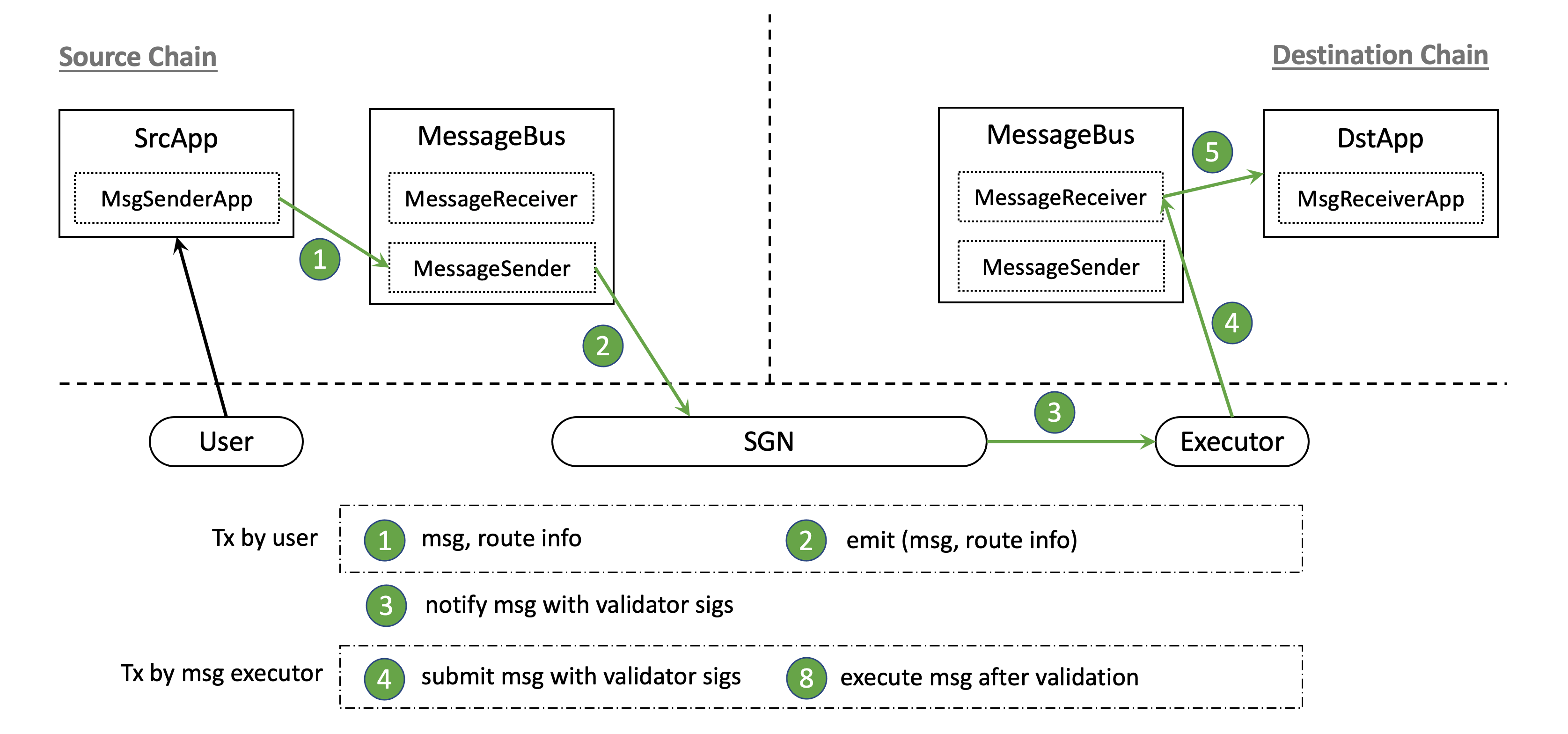 The SrcApp sends a message to the MessageBus contract on the source chain, which emits the message event. SGN catches the event and collects signatures from all validators. The executor then submits the SGN-signed message to the MessageBus contract on the destination chain, which will verify the message info and then call the message execution function of the DstApp.